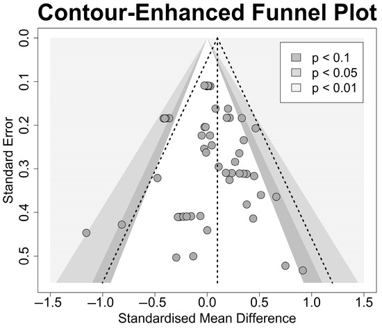 When we consider all studies, a total of k = 57 effect sizes from 23 studies were included in the analysis. The observed standardised mean differences (Hedge’s g) ranged from −2.45 to 0.92. The estimated average standardised mean difference based on the random-effects model was g = 0.10 (95% CI: −0.05 to 0.24). A forest plot showing the observed outcomes and the estimate based on the random-effects model is shown in Figure 4.