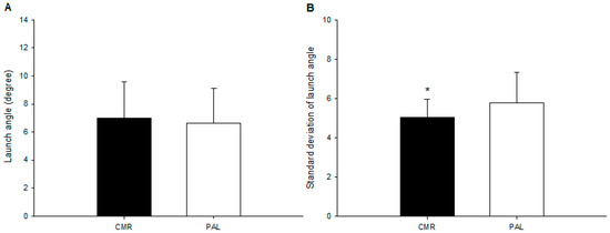 There was no significant difference in the average launch angle (CMR: 7.0 ± 2.6 degree; PLA: 6.6 ± 2.5; p = 0.420; Figure 2A) between the two trials. Nonetheless, the consistency of the launch angle of the CMR trial was significantly greater (CMR: 5.0 ± 0.9; PLA: 5.8 ± 1.5; p = 0.025; Cohen’s d = 0.69; actual power = 0.81; Figure 2B) than that of the PLA trial.