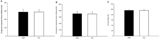 There was no significant difference in the congruent response instances (CMR = 288.0 ± 33.59 ms; PLA = 288.6 ± 31.04 ms; p = 0.926; Figure 3A), incongruent response instances (CMR = 353.4 ± 39.3 ms; PLA = 348.8 ± 33.4 ms; p = 0.515; Figure 3B) or rates of correct answers (CMR = 96.07 ± 2.66%, PLA = 95.87 ± 3.10%, p = 0.810; Figure 3C) in the Posner cueing task.