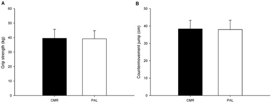 The results showed that there was no significant difference in grip strength (p = 0.601; Figure 4A) and the jump height of the countermovement jump (p = 0.777; Figure 4B) between the CMR and PLA trials.