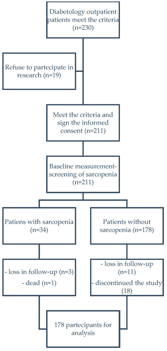 A total of 211 subjects were recruited consecutively to the nutritional intervention (Table 1). After six months, a total of 178 subjects completed the trial; the remaining 33 people were lost to follow-up. All subjects with type 2 diabetes mellitus were observed at baseline, screened for sarcopenia, educated about the nutritional indications, and re-evaluated after 26 weeks (Figure 1).