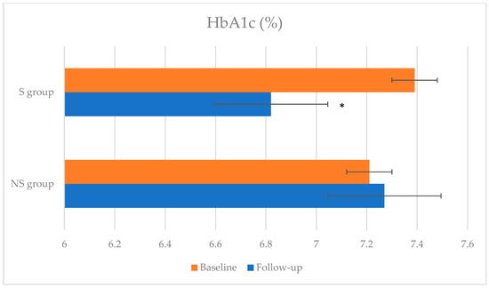Changes in glycated hemoglobin (%) at baseline and follow-up. * p < 0.05.