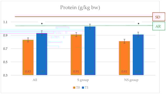 The dietary composition of both groups was close to the recommendations for people with diabetes, and the protein intake of all subjects increased (p = 0.03) over time; however, both groups had protein intake below the LARN-suggested dietary target (SDT) of 1.1 g/kg of body weight, both at baseline and at follow-up, but protein intakes (g/kg body weight) increased significantly as a result of the nutritional intervention. The NS group, unlike the S group, did not meet the recommended daily intake for the adult population of 0.9 g/kg of body weight. This finding has been widely observed in studies of older people; in fact, the geriatric population consumes less protein for a variety of reasons, including loss of appetite and changes in taste.