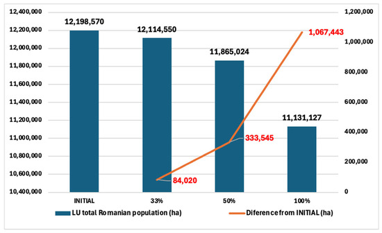 The results of our research highlight that by reducing the consumption of proteins of animal origin, even partially, Romania could save considerable areas of agricultural land. The analyzed scenarios with 33%, 50%, and 100% replacements show a clear trend of land-saving, with the highest benefits in the full replacement scenario. For example, in the scenario of 100% replacement of animal protein with plant-origin sources, land use could be reduced from 0.816 ha per capita up to 0.745 ha per capita and a cumulative reduction of 1,067,443 ha of land. This reduction could generate significant benefits not only for the protection of agricultural resources but also for the conservation of biodiversity and the fight against climate change.