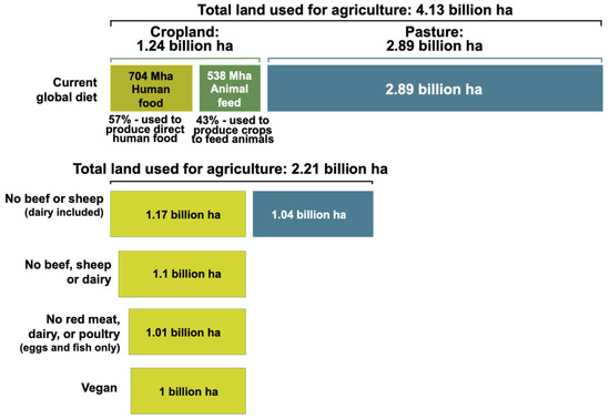 - Ritchie, H. If the World Adopted a Plant-Based Diet, We Would Reduce Global Agricultural Land Use from 4 to 1 Billion Hectares. Published Online at OurWorldinData.org. 2021. Available online: https://ourworldindata.org/land-use-diets (accessed on 10 August 2024).
