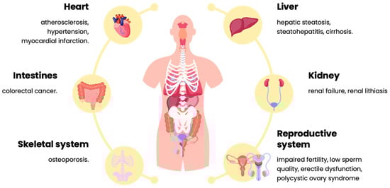 Studies show that diets high in saturated fat and cholesterol, mainly from beef, pork, and dairy products, are strongly linked to the development of cardiovascular disease. Excessive consumption of such products leads to an increase in the level of LDL (“bad”) cholesterol and, implicitly, to a higher risk of hypertension, atherosclerosis, and heart attack [62,63] (Figure 5). In addition, these diets contribute significantly to obesity, an increasingly widespread problem in Romania, which, in turn, is a major risk factor for type 2 diabetes.