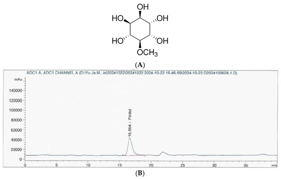 The Korea Health Functional Food Association (Seongnam, Republic of Korea) analyzed the D-pinitol content in the IPE (Figure 1). Briefly, HPLC analyses were conducted using an Agilent 1260 Infinity pumping system (Santa Clara, CA, USA) equipped with an Alltech 3300 evaporative light-scattering detector (ELSD, Milwaukee, WI, USA) and a YMC-Pack Polyamine II column (25 cm × 4.6 mm, 5 µm (YMC, Kyoto, Japan), flow rate 1.0 mL/min).