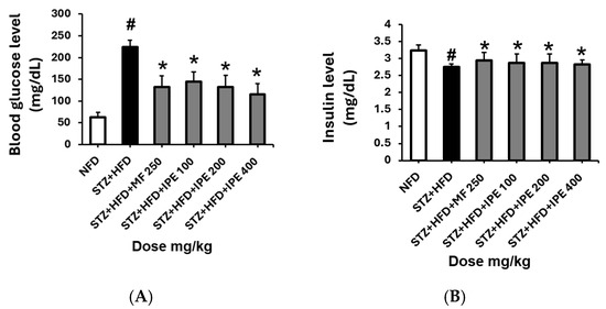 Effect of IPE on blood glucose and insulin levels in high-fat diet (HFD)/streptozotocin (STZ)-induced diabetic rats. (A) Effect of IPE on blood glucose level. (B) Effect of IPE on insulin level. NFD, normal-fat diet; STZ + HFD, streptozotocin + high-fat diet; STZ + HFD + MF, streptozotocin + high-fat diet + diabetic control + metformin. Values are expressed as means ± SEM (n = 8). # p < 0.001 compared with NFD group and * p < 0.05 compared with STZ + HFD group.