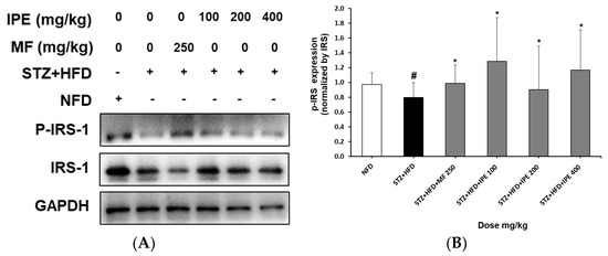 Effect of IPE on phosphorylation of IRS-1 in HFD/STZ-induced diabetic rats. (A) Western blots. (B) Quantitative graph of western blots. NFD, normal-fat diet; STZ + HFD, streptozotocin + high-fat diet; STZ + HFD + MF, streptozotocin + high-fat diet + diabetic control + metformin. Values are expressed as means ± SEM. # p < 0.01 com-pared with NFD and * p < 0.05 compared with STZ + HFD.