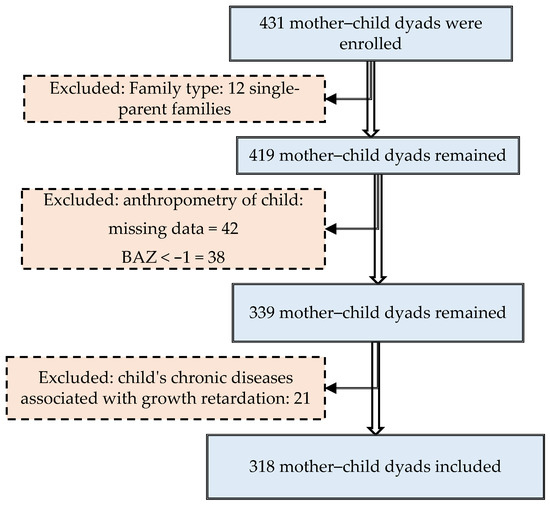 A total of 512 mothers were invited to participate in this study, of which 431 agreed to participate. However, certain cases were excluded during the data cleaning process. Specifically, 12 mother–child dyads were excluded because the mothers were from single-parent or broken families, which could influence the mother’s perception of the child’s body size and eating behaviors. In these cases, the primary caregiver might not have been the participating mother, or the child might have been under the care of multiple caregivers. Additionally, 42 children had missing anthropometric data, 38 children had a BAZ below −1, and 21 children had chronic illnesses that could potentially affect growth, including asthma, epilepsy, PFAPA (Periodic Fever, Aphthous Stomatitis, Pharyngitis, and Adenitis), Type 1 Diabetes Mellitus (DM), and cerebral palsy. After these exclusions, the final analysis included 318 mother–child pairs (see Figure 1).