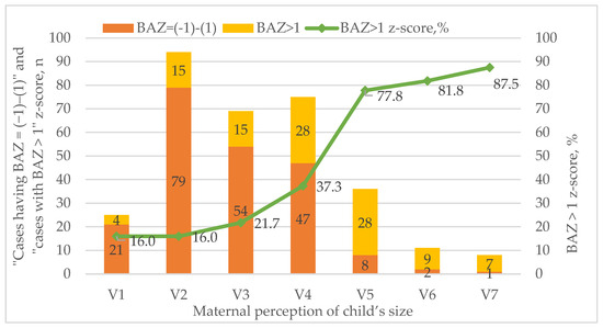 Maternal perceptions of children’s weight status, assessed through a visual tool, were compared with these objective measures to evaluate accuracy and trends in underestimation or overestimation (Figure 2). Maternal perceptions of child size were categorized into three groups, underweight (V1–V3), normal weight (V4), and overweight (V5–V7), based on the distribution pattern and the slope of the green line representing obesity rates (BAZ > +1). For the underweight category (V1–V3), obesity rates ranged from 16% to 21.7%. In the normal weight category (V4), the obesity rate was 37.3%. For the overweight category (V5–V7), obesity rates ranged from 77.8% to 87.5%.