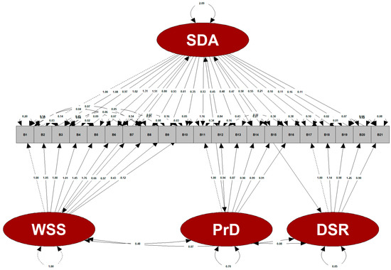 The relationships of four latent variables, including beverage addiction total score, withdrawal syndrome symptoms, persistent desire, and decrease in social and recreational activities, with the different observed variables (B1–B21) are shown in Figure 3. The fact that the factor loadings were relatively high (>1) in some items (B4, B2, B5, B6, B18, and B20) that contained the latent variables showed that using the robust bifactor-CFA was necessary to obtain more reliable results. According to the goodness-of-fit test of the constructed model (14 intrafactor modifications), the Yuan–Bentler corrected chi-square/df value of the model was 1.574 and (256.52/163) the model was a good fit with no significant difference between the observed and model data (p = 0.063). The model’s comparative fit index value was 0.947, the Tucker–Lewis index value was 0.932, the root mean square error of approximation value was 0.067, the standardized root mean square residual value was 0.039, the goodness-of-fit index (GFI) value was 0.909, and the adjusted goodness-of-fit index value was 0.857 (Table 4). These values indicate that the model has an acceptable fit.