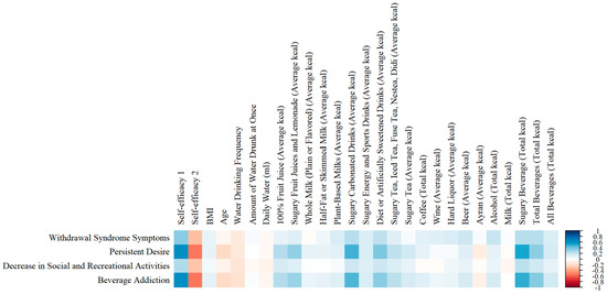 Examining the relationships between the scales showed a strong positive relationship between the total score of the Soft Drink Addiction Scale and self-efficacy-1 (r = 0.624; p < 0.001 ***) and a strong negative relationship with self-efficacy-2 (r = −0.537; p < 0.001 ***). Moreover, a moderate positive correlation was observed between the Soft Drink Addiction Scale total score and total beverage kcal from the beverage consumption questionnaire (r = 0.364; p < 0.001 ***) (Figure 4).
