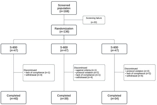 The initial screening population was 168 individuals, of which 32 were screened out, leaving 136 participants to be randomly assigned. In the S-400 group, 5 of the 45 allocated participants were excluded, allowing 40 participants to complete the trial. In the S-800 group, 8 of the 47 allocated participants were excluded, resulting in 39 participants completing the trial. In the placebo group, 10 of the 44 were excluded, leading to 34 participants completing the trial. The CONSORT diagram is shown in Figure 1.