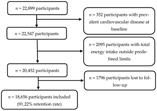 For this study, a total of 22,899 participants recruited before September 2020 were eligible for the analysis of incident CVD, ensuring that they were able to complete at least the first follow-up questionnaire. We excluded 352 participants with pre-existing CVD, as well as 2095 participants who fell outside predefined limits of total energy intake (<800 kcal/d or >4200 kcal/d for men and <500 kcal/d or >3500 kcal/d for women) [26] and 1796 participants without follow-up. As a result, 18,656 participants were included in our final analysis (Figure 1).