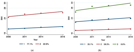 Group identification of BMI trajectories in elderly individuals completing at least two rounds of BMI. (a) For 2 trajectories; (b) for 3 trajectories.