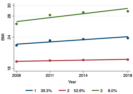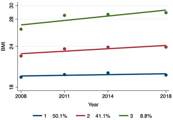 Three groups of BMI trajectories were identified using the GBTM. As shown in Table 1 and Figure 1, based on the BIC, AIC, ll values, Entropy, and average posterior probabilities, as well as the sample sizes for each locus, the three groups of BMI trajectories were the most realistic. Most participants (58.3%) remained relatively stable during the follow-up; some participants (35.1%) progressed from a normal BMI at baseline (BMI < 24) to overweight in 2018 (BMI > 24). The BMI trajectory of 6.6% of participants quickly jumped from overweight (BMI > 24) at baseline to obesity (BMI > 28). Therefore, the three BMI trajectory groups were labeled as “overweight”, “normal”, and “obesity”.