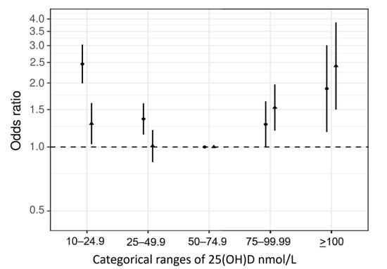 For the sensitivity analyses to explore the association between 25(OH)D and fall risk in the context of high inflammation, we repeated the categorical analysis in a rheumatoid arthritis patient population (typically characterized by higher inflammation). In this setting, the association between both lower and higher 25(OH)D and increased fall risk was consistent and significant among those who fell and had rheumatoid arthritis (915 cases, 238,968 controls) (≥100 nmol/L vs. 50–74.99 nmol/L: OR = 1.64, 95%, CI, 1.00–2.69, p < 0.05; and <25 nmol/L vs. 50–74.99 nmol/L: OR = 1.28, 95%, CI, 1.03–1.60, p = 0.03) (see Table S8). To explore the association in the context where inflammation is not present, we repeated the categorical analysis by restricting it to falls occurring below <5 mg/L CRP, and this reflected an association with fall risk in the deficiency categories (Table S9).