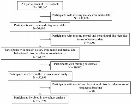 Therefore, we conducted a cross-sectional and cohort study using data from the UK Biobank (UKB) to explore both the cross-sectional and longitudinal associations between dietary iron intake and mental and behavioral disorders due to the use of tobacco. Additionally, we employed restricted cubic spline curves to clarify the dose–response relationship between dietary iron intake and mental and behavioral disorders due to the use of tobacco.