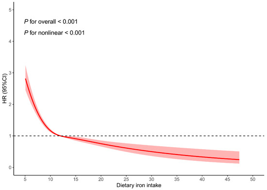 After excluding participants with extreme dietary iron intake or extreme energy intake, the findings remained consistent with the main analysis (Supplementary Tables S4 and S5). When participants with extreme dietary iron intake were removed, in Model 4, groups Q2 (HR: 0.62, 95% CI: 0.55–0.70, p < 0.001), Q3 (HR: 0.60, 95% CI: 0.52–0.68, p < 0.001), and Q4 (HR: 0.49, 95% CI: 0.42–0.57, p < 0.001) had reduced risk compared to group Q1. When participants with extreme energy intake were removed, in Model 4, groups Q2 (HR: 0.59, 95% CI: 0.53–0.67, p < 0.001), Q3 (HR: 0.57, 95% CI: 0.50–0.65, p < 0.001), and Q4 (HR: 0.48, 95% CI: 0.41–0.56, p < 0.001) had reduced risk compared to group Q1.