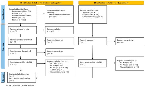 Studies meeting the following criteria were included: (a) observational studies, including cross-sectional, cohort, and case-control designs; (b) conducted with women diagnosed with GDM; (c) provided data on diet consumed during pregnancy; and (d) reported information on gestational weight gain. Studies conducted with animals, abstracts without full text, reviews, studies involving pregnant women with type 1 or type 2 diabetes mellitus, and strategies involving physical activity were excluded.