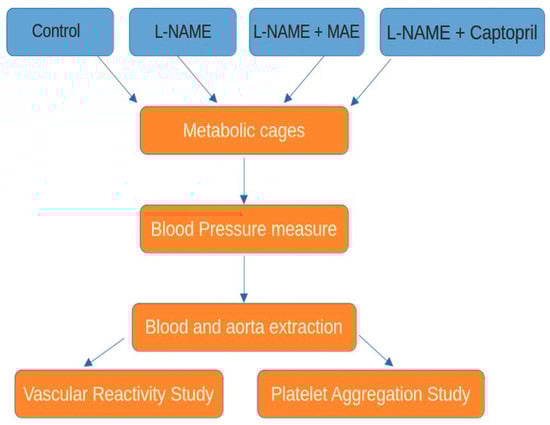 Previous studies from our laboratory, focusing on two animal models of arterial hypertension, have linked the antihypertensive effects of several flavonoid-rich extracts to an increase in nitric oxide levels [,]. Building on this research, the present study aims to analyze the cardiovascular, vascular, platelet, and renal effects of an ethanolic extract of M. alba leaves in an experimental model of arterial hypertension induced by nitric oxide deficiency. This model is particularly suitable for testing substances that may increase NO production and reduce oxidative stress, as these are two key mechanisms underlying L-NAME-induced hypertension. By inhibiting nitric oxide synthase, L-NAME treatment leads to decreased NO bioavailability and increased reactive oxygen species (ROS) production, resulting in endothelial dysfunction and vasoconstriction. Furthermore, this model allows for the direct assessment of a compound’s ability to counteract the specific pathophysiological changes associated with NO deficiency, including increased NADPH oxidase activity and reduced antioxidant capacity. Thus, the L-NAME hypertension model provides an ideal platform to evaluate the potential of M. alba extract (MAE) in restoring NO-dependent vascular function and mitigating oxidative-stress-induced cardiovascular alterations.