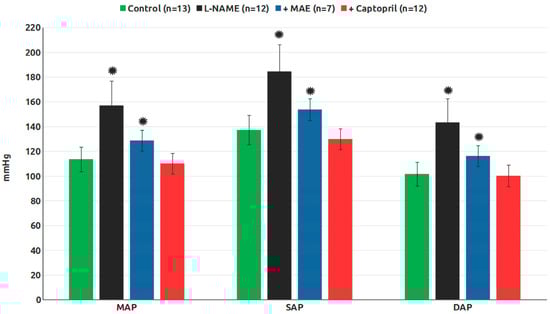 Blood pressure in the experimental groups (MAP, mean arterial pressure; SAP, systolic arterial pressure; DAP, diastolic arterial pressure). *, p < 0.05 vs. control group.