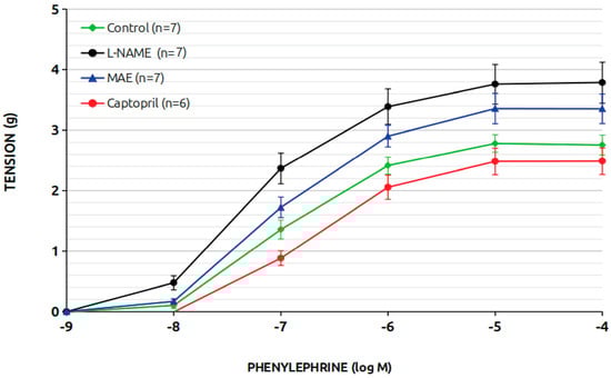 Figure 3 depicts the vasoconstrictor response of aortic rings to phenylephrine. The L-NAME-treated group exhibited an enhanced response compared to the control group. While simultaneous MAE treatment reduced this response, it remained higher than in the control animals. Captopril treatment effectively diminished the vasoconstrictor response.