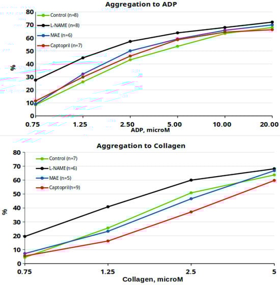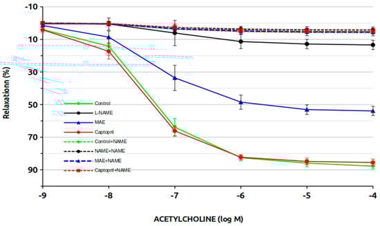 In conclusion, MAE exhibits antihypertensive effects and improves vascular reactivity and platelet aggregation in an experimental model of arterial hypertension caused by nitric oxide deficiency. These beneficial effects appear to be closely related to enhanced nitric oxide activity [,].