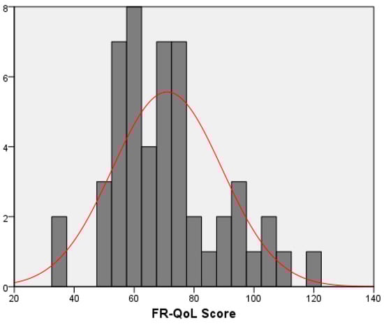 Overall, the entire study population associated a relatively low mean (SD) FR-QoL score of 71.03 ± 18.3 (Figure 1). Scores were similar between genders, 71.2 ± 18.6 for girls and 70.9 ± 18.3 for boys, p = 0.953.