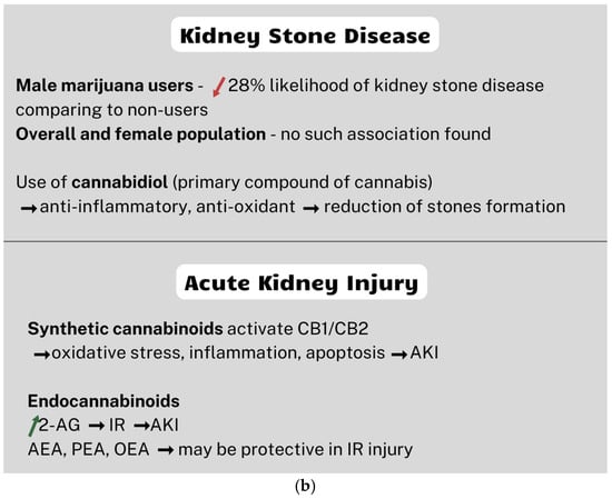 What is more, cannabidiol, a primary component of cannabis, has anti-inflammatory and antioxidant abilities [136]. Inflammation and oxidative stress have crucial roles in the formation of kidney stones [158,159]. Therefore, it is possible that cannabidiol mitigates inflammatory responses and reduces oxidative stress, potentially contributing to a lower risk of kidney stone development (Figure 2b) [154].