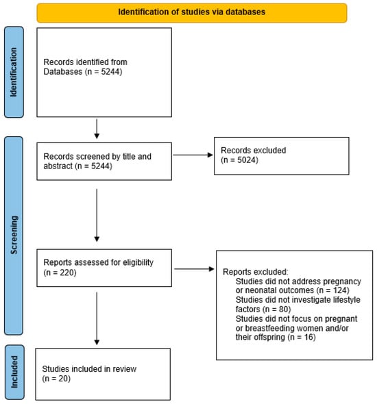 APA StyleFavara, G., Maugeri, A., Barchitta, M., Lanza, E., Magnano San Lio, R., & Agodi, A. (2025). Maternal Lifestyle Factors Affecting Breast Milk Composition and Infant Health: A Systematic Review. Nutrients, 17(1), 62. https://doi.org/10.3390/nu17010062