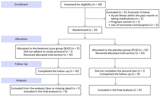 The present study utilized a randomized controlled trial (RCT) design to assess the effects of beetroot juice supplementation on aerobic performance in female athletes. The RCT design was selected due to its established robustness and reliability in clinical research, as it enables the control of confounding variables and ensures the validity and reproducibility of results. This approach is particularly advantageous in assessing interventions where randomization minimizes selection bias and increases internal validity. Participants were randomly assigned to one of two groups: the experimental group (beetroot juice supplementation group, BJG) or the control group (placebo group, PLG). The BJG received a nitrate-rich beetroot juice intervention, while the PLG received a placebo beverage containing no nitrates. This design allows for a comparison between the effects of beetroot juice and a neutral placebo, providing insight into its potential benefits for endurance performance. Both groups followed identical protocols, ensuring that the only difference between them was the supplementation provided.