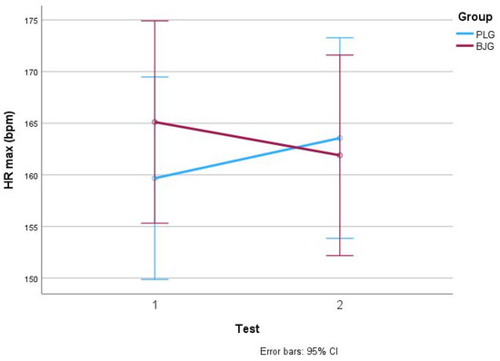 Statistically significant changes in mean heart rate in BJG and PLG after test 1 and test 2 were observed and are shown in Figure 3. Mean heart rate (HR) in the BJG group changed significantly after the second test (p < 0.05), decreasing from 165 ± 9 to 162 ± 10 bpm. On the other hand, in the PLG group, HR increased from 160 ± 9 to 164 ± 8 beats per minute after the first and second tests. Vertical bars represent 95% confidence intervals of the mean.
