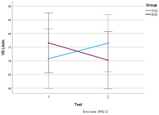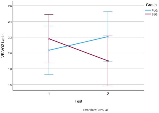 The ventilatory equivalents for oxygen (VE/VO2) increased by 0.84% in the PLG group (from 2.21 ± 0.38 to 2.23 ± 0.38; d = 1.6, p = 0.001), while in the BJG group, VE/VO2 decreased from 2.10 ± 0.49 to 1.90 ± 0.38 (d = 1.1, p = 0.006) (see Figure 5).