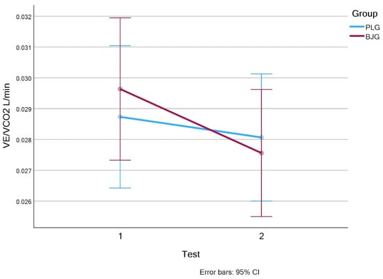 In addition, significant improvement was also observed in ventilatory equivalent VE/VCO2 scores and was statistically significant in the BJG group (p < 0.025). VE/VCO2 decreased after the second test in the BJG group from 0.030 ± 0.00 to 0.028 ± 0.00 (d = 0.9, p = 0.025), indicating more efficient gas exchange and CO2 elimination. On the contrary, this indicator increased in the PLG group, indicating a lower efficiency of the respiratory system at a similar load (Figure 6). This improvement is essential under conditions of prolonged exercise, where higher ventilation efficiency helps to reduce fatigue and maintain performance [37,38].