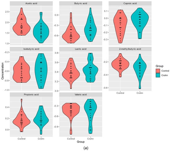 Elevated propionic acid concentrations were observed in patients with IBDs treated with trimebutine (p-value = 0.031) and higher isobutyric acid concentrations were found in patients treated with biological drugs compared with untreated patients (p-value = 0.014) [].