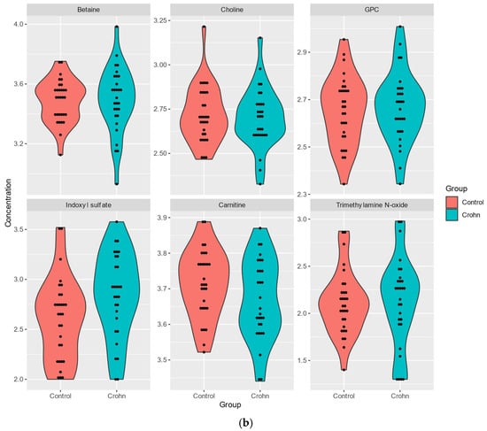 Sixteen (55.17%) patients with Crohn’s disease were treated with immunosuppressive drugs, which did not result in significant statistical differences in the profile of metabolites in blood plasma, similarly to ASA therapy (26 patients; 89.65% with Crohn’s disease).