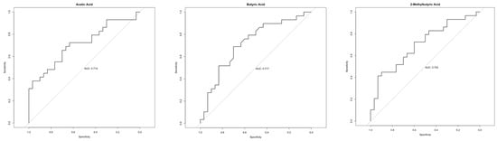 The ROC curves analysis was performed and the area under the curve (AUC) was calculated to determine whether the analyzed metabolites could serve as new diagnostic biomarkers of Crohn’s disease. The highest values (AUC > 0.7; moderate discrimination power) were achieved for SCFAs: AA (AUC = 0.714), BA (AUC = 0.717), and 2MeBA (AUC = 0.702)—Figure 2.