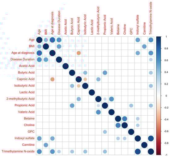 Metabolite correlation analysis (positive correlations are shown in blue; negative correlations in red).