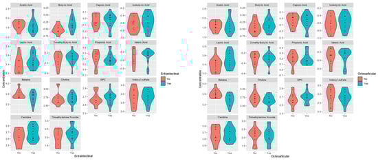 Violin plots for the analyzed plasma metabolites’ differences between plasma patients CD with (yes) extraintestinal and osteoarticular complications and without (no).