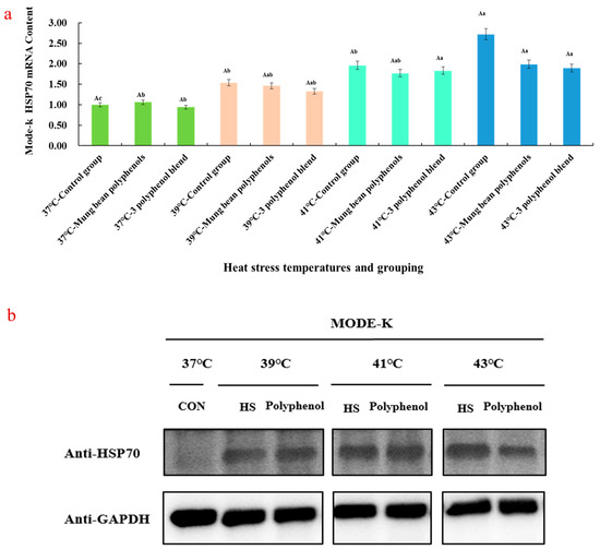 Effect of heat stress and mung bean polyphenol modulation on HSP70 mRNA and protein expression in Mode-k cells. (a) Regulation of HSP70 mRNA levels in Mode-k cells by mung bean polyphenols under different heat stress degrees (In the significance analysis of the bar chart, “A” represents the significant difference within the group; ’a, b, c’ represents inter group differences.); (b) effect of mung bean polyphenols on the expression level of HSP70 protein in Mode-k cells under different heat stress temperatures.