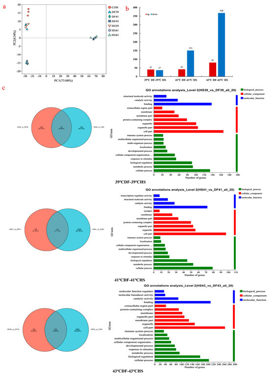 Figure 5c shows Venn and functional annotation diagrams of three differentially expressed genes regulated by temperature heat stress and mung bean polyphenol heat stress. There were 50 (Table S7), 47 (Table S8), and 254 (Table S9) genes that underwent significant changes after heat stress at 39 °C, 41 °C, and 43 °C, respectively, and regulation of mung bean polyphenols. Except for a few genes, the differentially expressed genes between the three temperature heat stress and mung bean polyphenol groups were all reverse-expressed, indicating that mung bean polyphenols regulated heat stress by reverse-regulating differentially expressed gene expression. GO annotation was performed on differentially expressed genes and showed that the biological processes involved in heat stress and mung bean polyphenol regulation mainly included biological regulation; metabolic processes; cellular component organisation or biogenesis; cellular processes; developmental processes; and responses to stimuli, localisation, and other pathways. Molecular functions mainly involved binding, catalytic activity pathways, structural molecular activity, and molecular function regulator and transporter activity. Cellular components involved cellular components, organelles, organelle components, membranes, membrane components, and complex pathways containing proteins.
