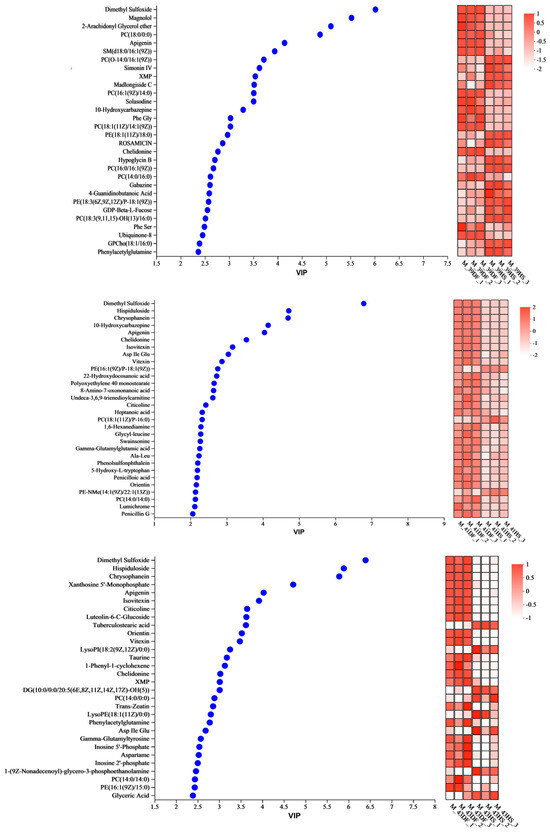 Metabolic analysis of VIP values in different comparison groups. Note, in the above figure, the left side is the dendrogram of metabolite clustering, and the right side is the name of the metabolite. The left side of the VIP value graph is the metabolite VIP bubble graph. The y-axis indicates the metabolite, and the x-axis is the VIP value. Metabolites are arranged according to the size of the VIP value, from top to bottom. On the right side is the metabolite expression heatmap. Each column represents a sample, with the sample name below. Each row represents one metabolite. The colour indicates the relative expression size of the metabolite in that group of samples, and the numerical magnitude is shown in the gradient colour block.