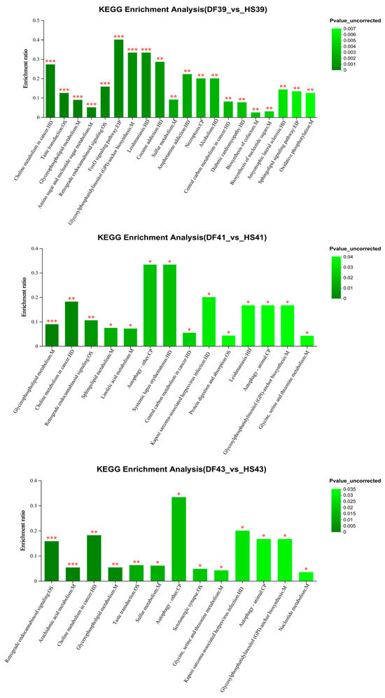 Results of enrichment analysis of KEGG metabolic pathways regulated by different heat stress temperatures for mung bean polyphenols. * Represents p < 0.05, ** represents p < 0.01, *** represents p < 0.001.