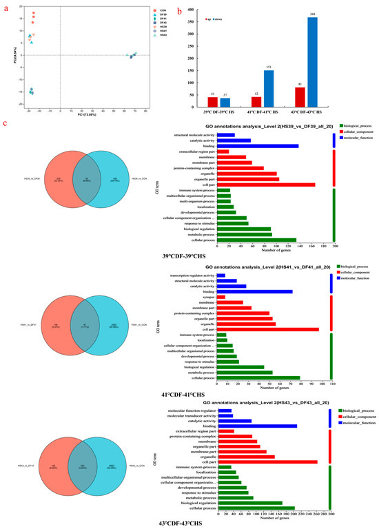 The clean data of each sample reached ≥6.04 Gb. The clean reads of each sample were sequentially aligned with the designated reference genome, with alignment rates ranging from 93.55 to 95.5%. Figure 5a shows the PCA results for gene expression. The dispersion degree within gene sample point groups under different heat stress temperatures was very small, with each having its own aggregation zone. There was considerable distance between sample point groups under the different temperature heat stress and mung bean polyphenol groups, and the distance from the control group increased with temperature, indicating that heat stress caused significant differences in gene expression in Mode-k cells and that the higher the temperature, the greater the difference. Polyphenol treatment of mung beans can affect gene expression. Based on the quantitative expression results, inter-group differential gene analysis was performed to determine genes with differential expression between two sample groups. The statistical results are shown in Figure 5b, in which red and blue represent the number of upregulated and downregulated genes, respectively. Evidently, the gene expression changes under different temperature and heat stress conditions after treatment with mung bean polyphenols increased with temperature.
