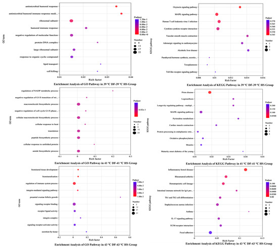 GO and KEGG pathway enrichment analyses were performed on all differentially expressed genes to determine the regulatory functional pathways of differentially expressed genes and the main signal transduction pathways involved (i.e., the 10 pathways with the most significant p-value). The enrichment analysis results are shown in Figure 6. The differential genes regulated by mung bean polyphenols at 39 °C mainly involved pathways such as antimicrobial humoral response, antimicrobial peptide-mediated antimicrobial humoral immune response, ribosomal subunits, humoral immune response, negative regulation of molecular function, protein–DNA complexes, large ribosomal subunits, response to organic cyclic compounds, lipid transport, and cell killing. Those at 41 °C mainly involved pathways such as cell ribosomes, ribosome subunits, the regulation of NADP metabolism, transparent band receptor complexes, the negative regulation of G1/S phase transition in the mitotic cell cycle, the macromolecular biosynthesis process, the negative regulation of the G1/S phase transition in the cell cycle, the biosynthesis process of macromolecules, the cellular response to heat, translation, etc. Those at 43 °C mainly involved the development of biomineral tissues, biomineralisation, the regulatory processes of the immune system, integrin-mediated signalling pathways, pre-ovarian follicle growth, signal receptor binding, receptor ligand activity, integrin complexes, the activity of signal receptor activators, tissue secretion, etc. The key differential gene functions regulated by mung bean polyphenols varied at different temperatures.