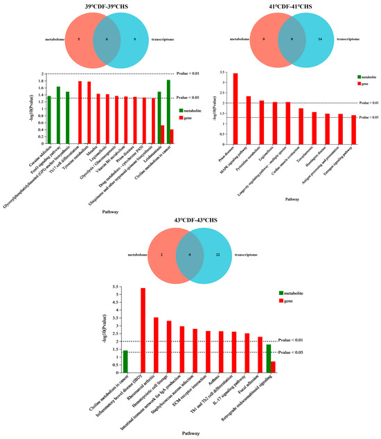 Under heat stress temperatures of 39 °C, 41 °C, and 43 °C, there were 14, 14, and 24 pathways with significant changes in gene and metabolic sets (p < 0.05) (Figure 7), respectively (Tables S13–S15 for detailed information).