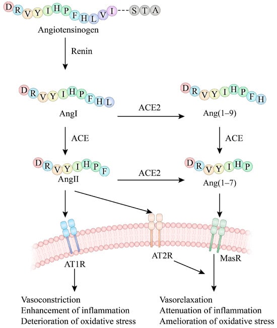 In 1898, Tigerstedt et al. [12] extracted a heatable substance from rabbit kidneys and found that it had an antihypertensive effect, which was subsequently recognized as “renin”. Thereafter, the classical RAS was finally established with the discovery of angiotensin (Ang), angiotensin I (Ang I), ACE, and angiotensin II (Ang II) [13]. In the RAS, Ang secreted by the liver flows into the plasma and is hydrolyzed in the presence of renin secreted by the paraglomerular apparatus to Ang I. Ang I, a decapeptide with no pressor-raising ability, is catalyzed by ACE by cutting off the two amino acids at the C-terminal end and is converted to the octapeptide Ang II, which has a strong pressor-raising effect [14]. On the one hand, Ang II is able to bind to AT1R to cause vascular smooth muscle cell (VSMC) contraction and also stimulate aldosterone release to cause sodium and water retention in the kidneys, leading to an increase in blood pressure [15]. On the other hand, Ang II induces vasodilation, NO release, and inhibits cell growth by binding to angiotensin type II receptor (AT2R) [16].