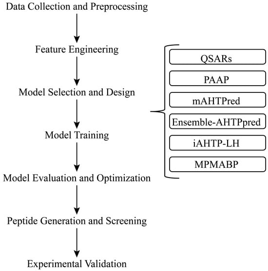 As compared with traditional structure–activity relationship research, the application of artificial intelligence algorithms to construct and optimize structure–activity relationship models improved the accuracy and efficiency of antihypertensive peptide predictions (Figure 3), which could facilitate the identifications of novel ACE inhibitory peptides and provide new options for the treatment of hypertension. Manavalan et al. [49] developed a new meta-predictor, mAHTPred, for the prediction and identification of antihypertensive peptides, which exhibited better prediction performance than existing methods on both benchmarking and independent datasets. However, mAHTPred has limitations in feature selection and algorithm choice. Despite using various feature encodings and machine learning algorithms, many potential features remain unexplored and redundant features may still affect model performance. Kalyan et al. [50] introduced a machine learning-empowered web server that predicts whether food-derived peptides have the ability to inhibit ACE. The web server can accept FASTA format or UniProt ID as input, perform digestion and screening, and output peptides with ACE inhibitory activity and their details. The regression decision tree model can accurately predict the IC50 values of peptides. The molecular docking results show the binding site and key residues of the peptide to ACE.